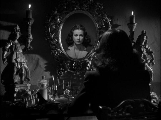 Fritz Lang’s Secret Beyond The Door (1947) has a historical standing as a flawed entry within the German filmmaker’s acclaimed run of bleak and formally stark noirs in 1940s Hollywood. It even shares the same narrative facade on paper: Celia (Joan Bennet), a gorgeous heiress, falls for the cryptic Mark (Michael Redgrave), a man she barely knows, after a rambunctious romance in Mexico, and quickly moves to his New York home, where his true nature hides behind locked doors. The film’s divergent nature is readily apparent from the start, as a haunting cacophony of bells and diffuse water reflections evoke Celia’s wondrous soliloquy about dream interpretation. Unlike the Hitchcockian tradition of psychoanalytical tirades, Lang doesn’t use Freudian iconography for conceptual blunt force or out of narrative motive. His positionality is that of sensuous fascination, embracing the inherent contradictions of this cognitive spiral and letting it wash over the film’s perceptive anchors.